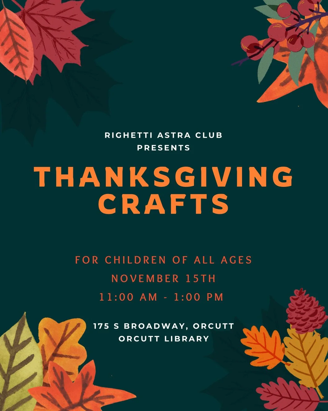 Please join us at the Orcutt Library Branch on Saturday, November 15th, for our ALL ages monthly crafts presented by Righetti ASTRA Club! This month’s theme will be Thanksgiving.